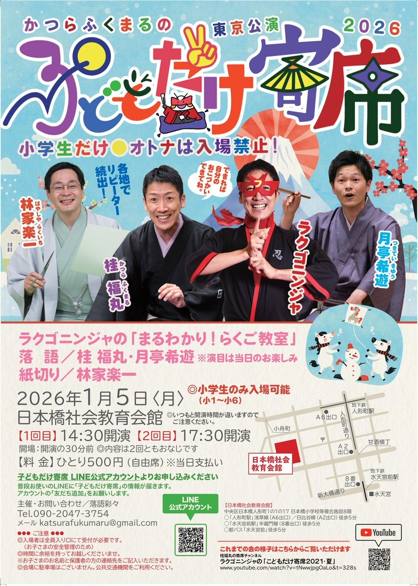 ②ラクゴニンジャによる落語解説、子どもむけのたのしい落語を聴いていただきます。寄席のすごい曲芸や鳴り物紹介が入る場合もあり!